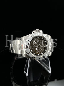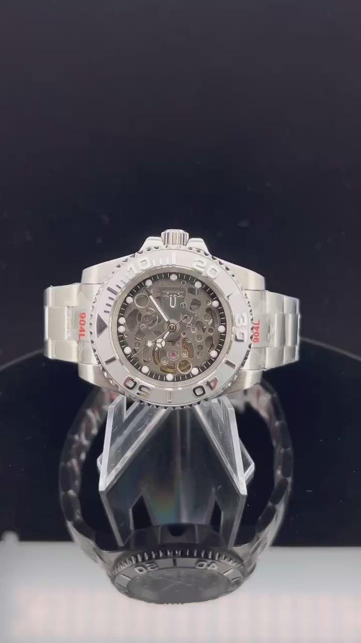 Introducing the SEIKO Yacht-Master MODS Watch Skeleton, a captivating timepiece that combines the iconic design of the Rolex Yacht-Master Case with the mesmerizing beauty of an Skeleton dial, MB Hands Silver Yacht-Master Insert. This homage watch showcases the intricate inner workings of the watch, allowing you to witness the rhythmic motion of the Seiko NH70 Automatic movement in action.
